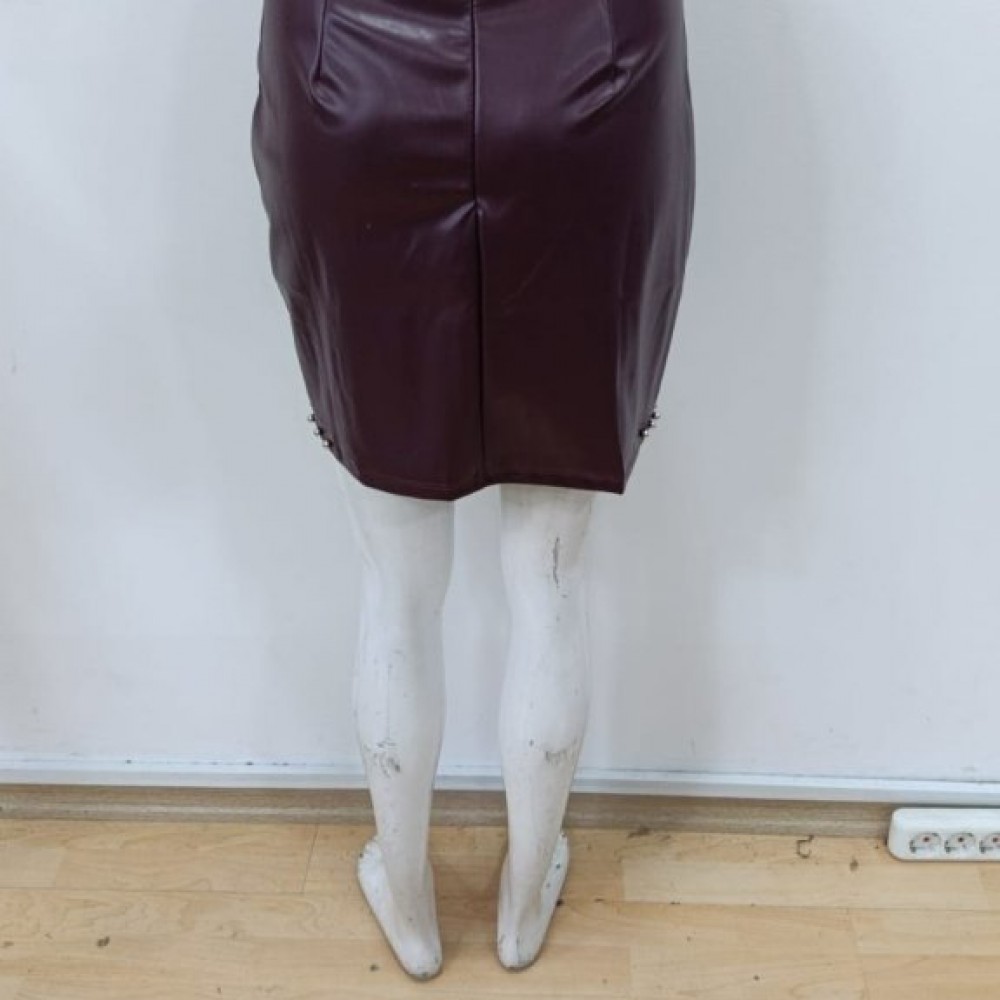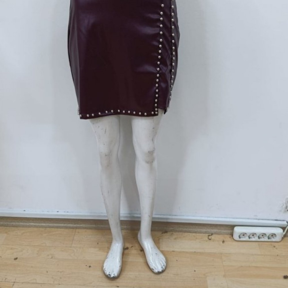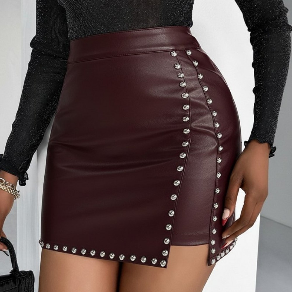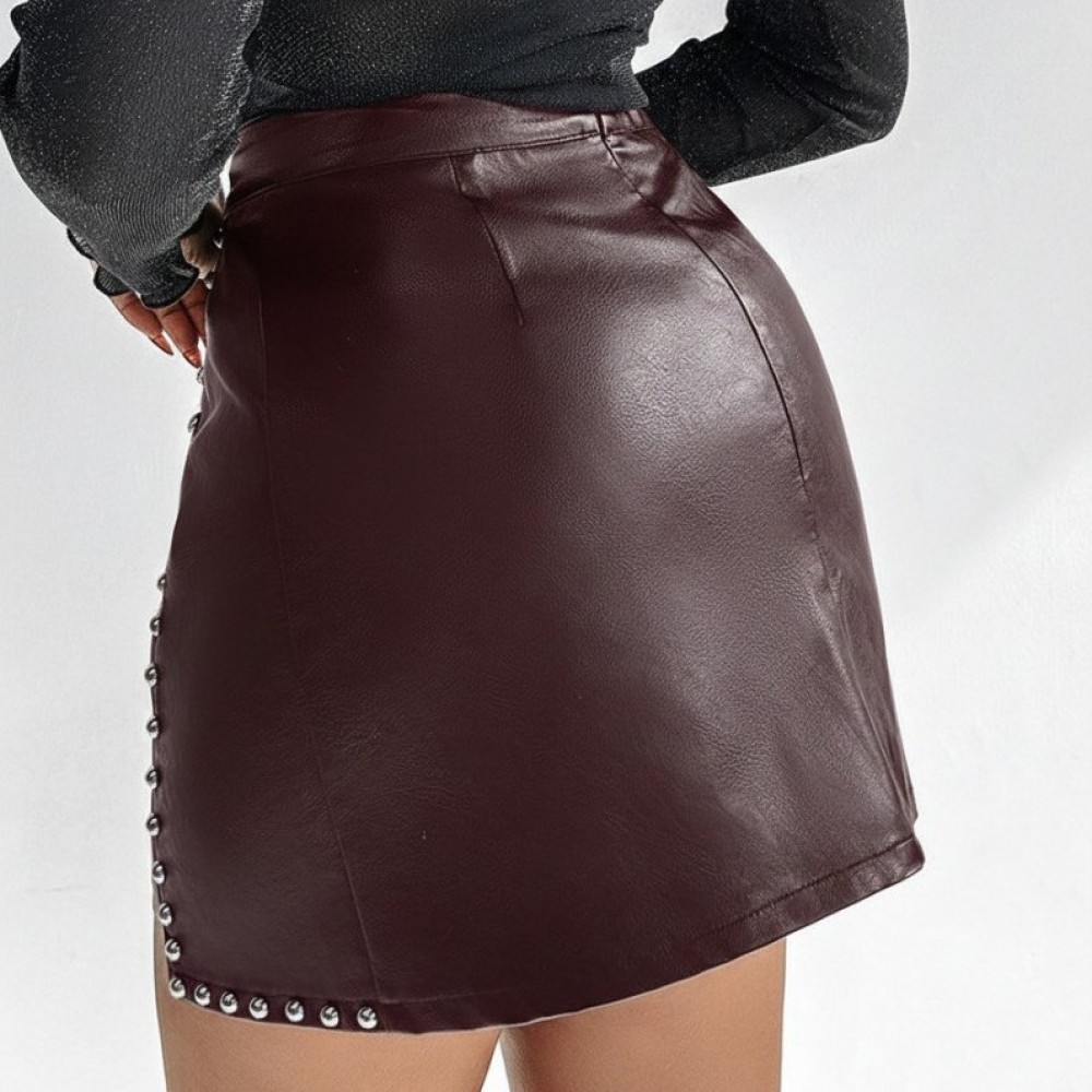 Kadın Yüksek Belli Yandan çivili Mini Deri Etek