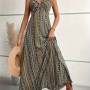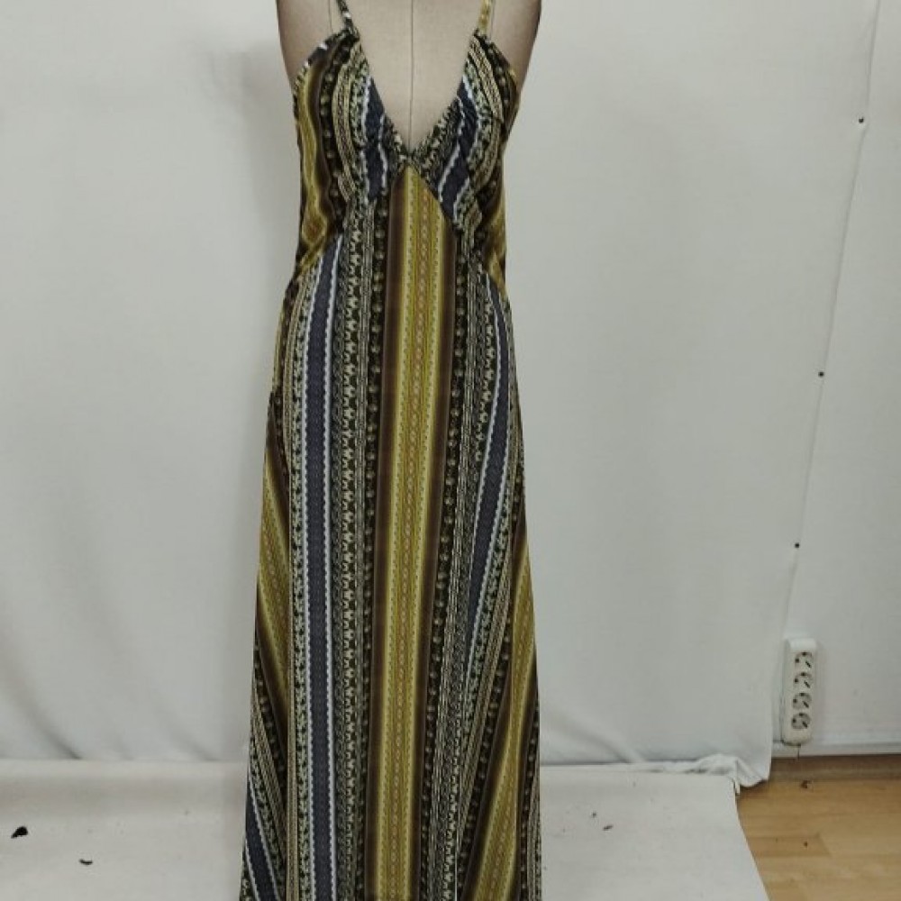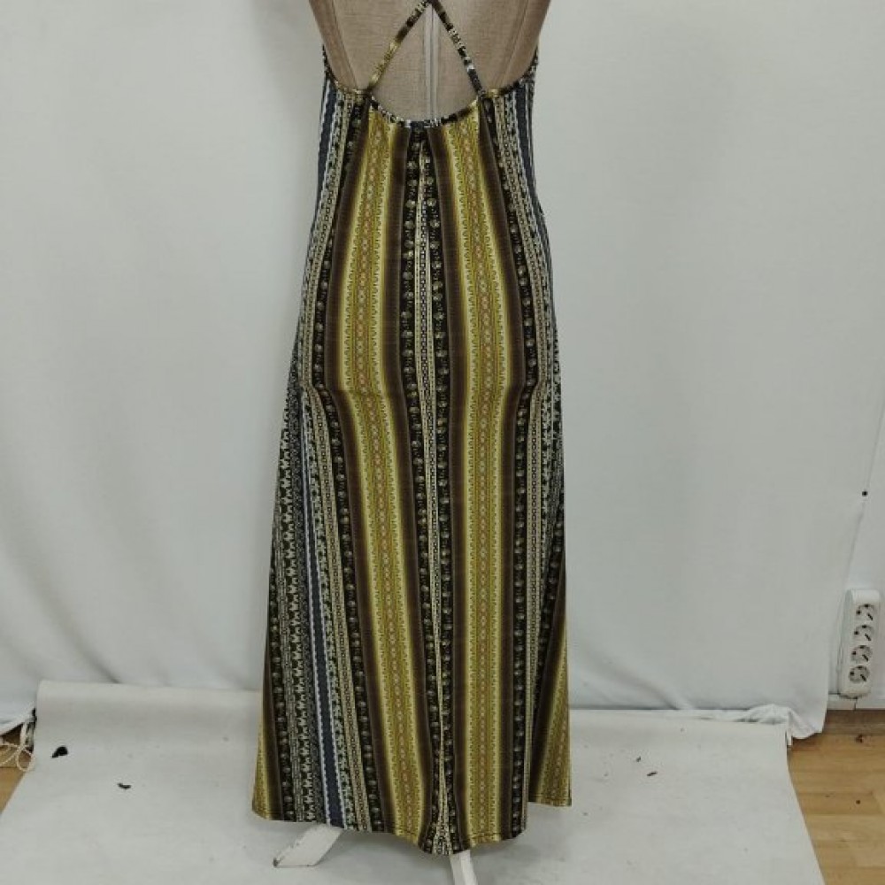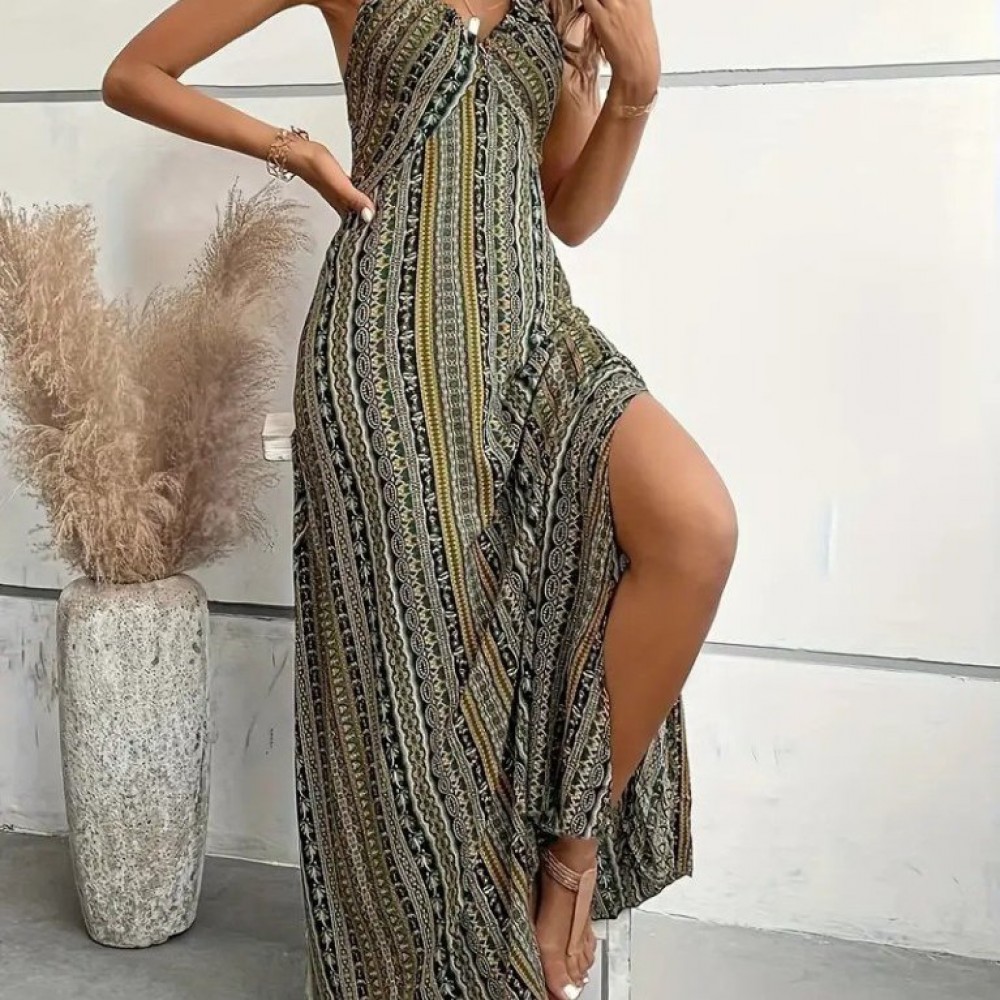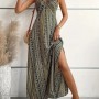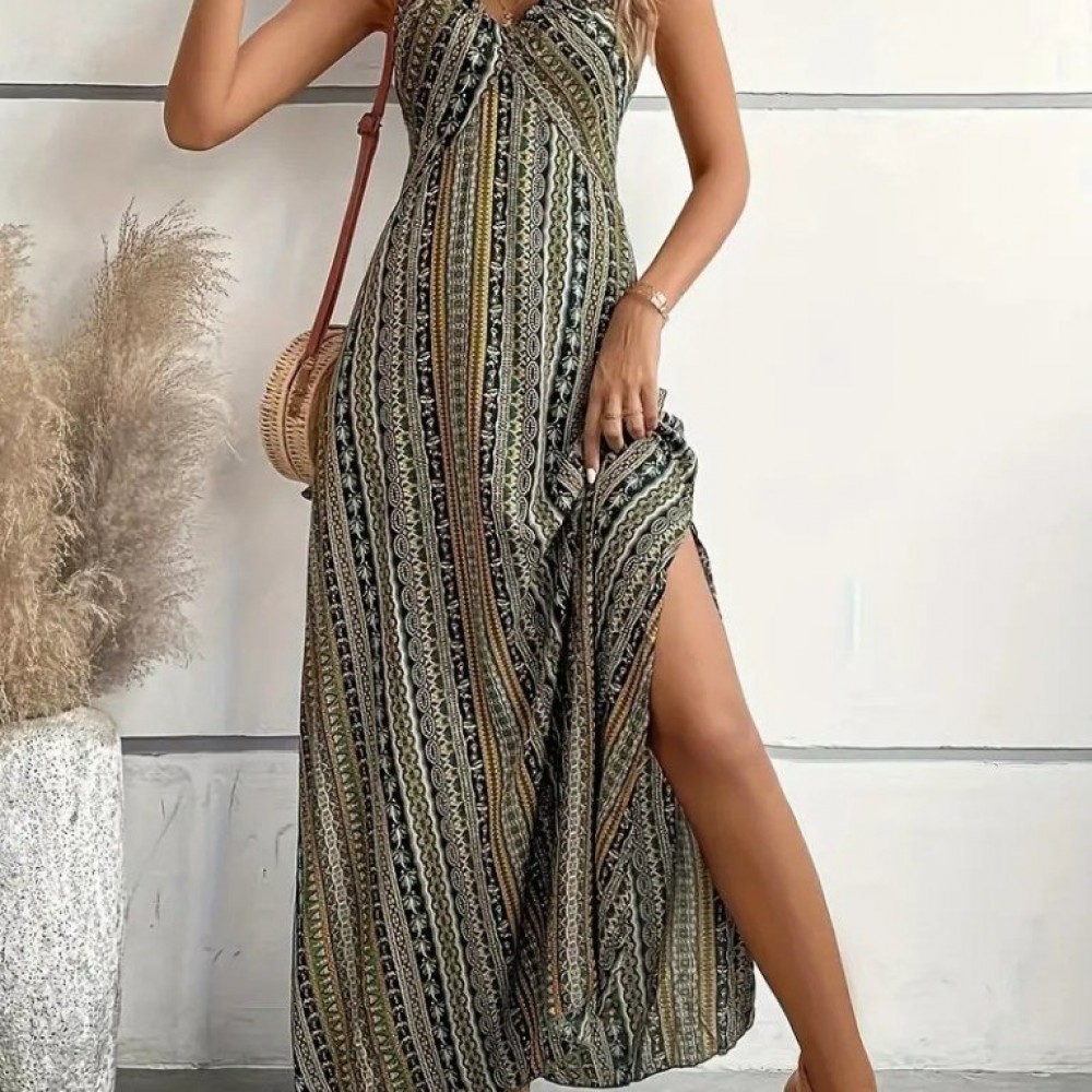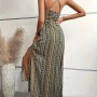 Kadın Ip Askılı Sırttan çapraz Detaylı Yırtmaçlı Desenli Süprem Elbise