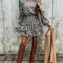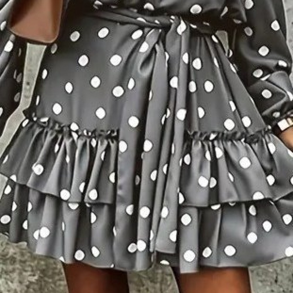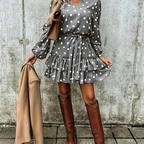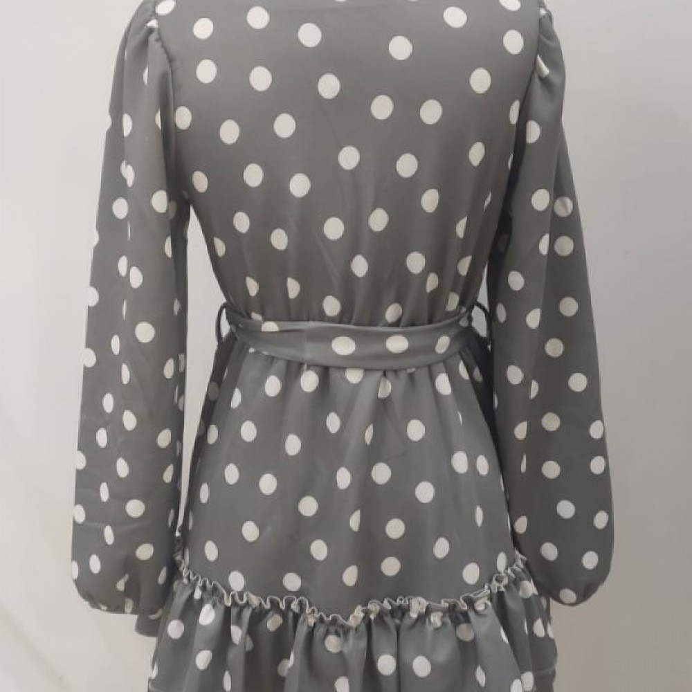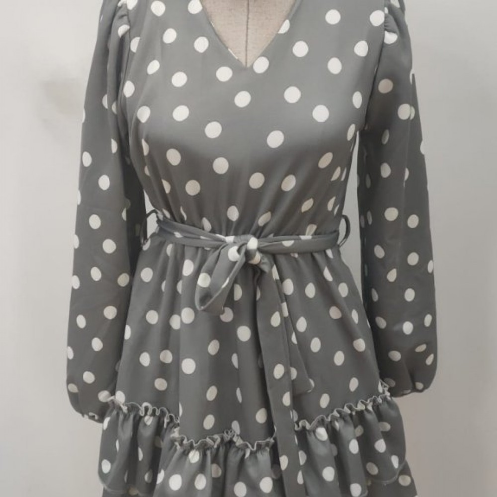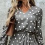 Kadın Uzun Kollu V Yakalı Belden Kuşaklı Puantiyeli Mini Modal Elbise