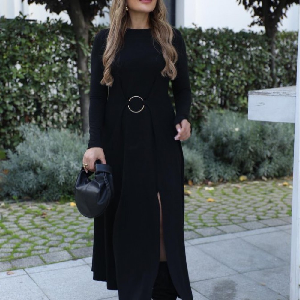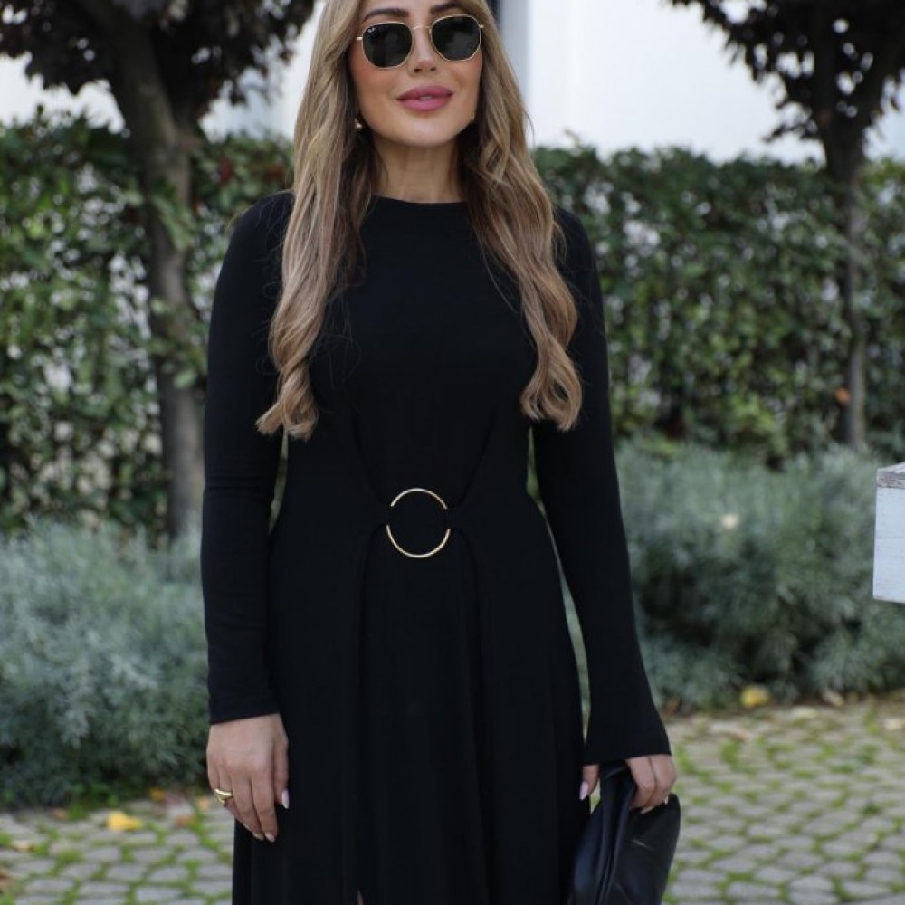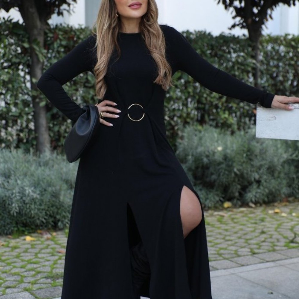 Kadın Uzun Kollu Bisiklet Yaka önden Halka Detaylı Yırtmaçlı Uzun Visk