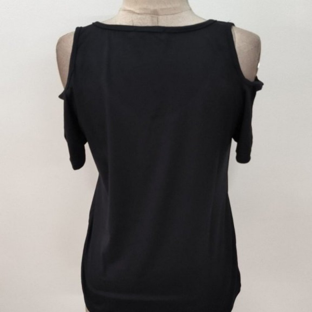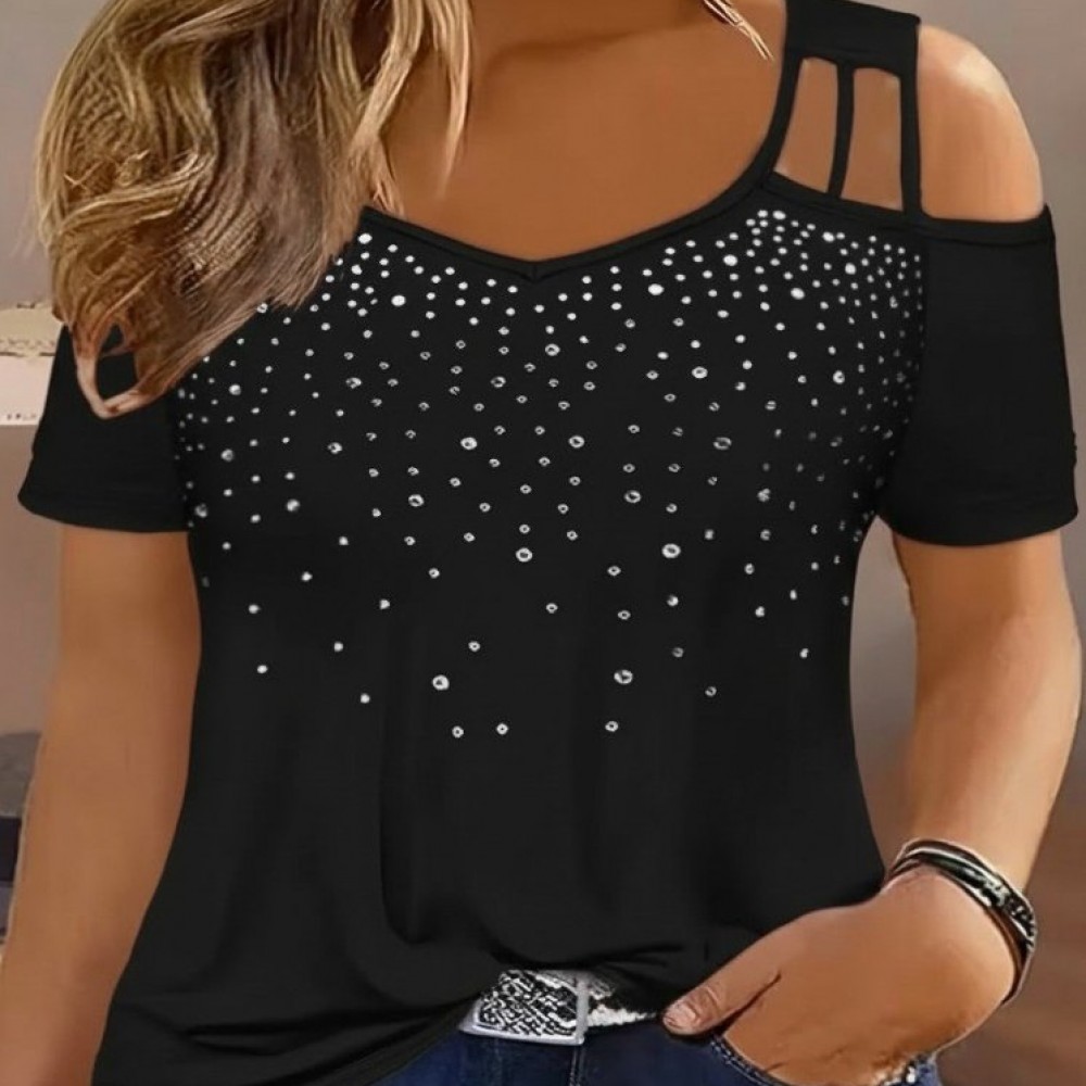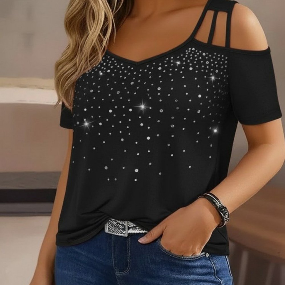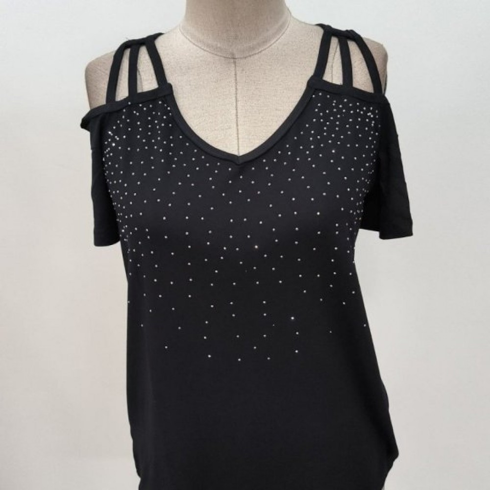Kadın Kısa Kollu Omuzlardan Açık Taşlı Viskon Bluz