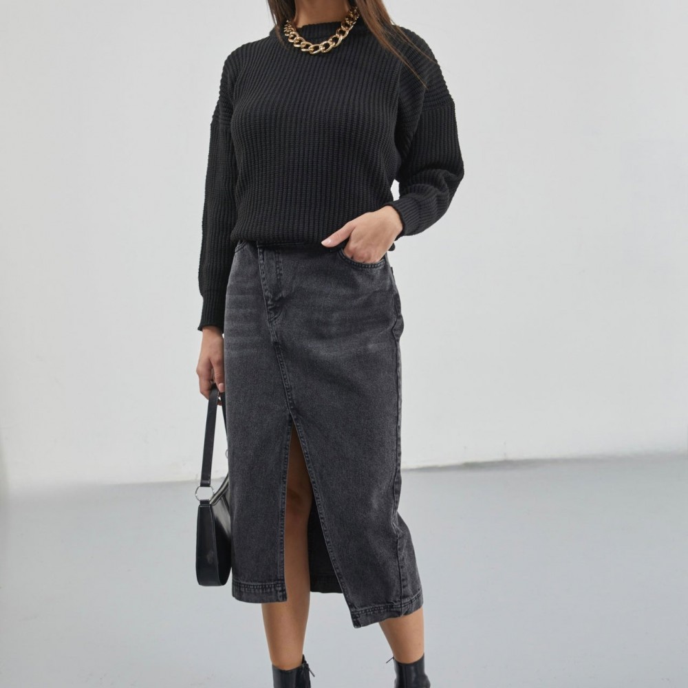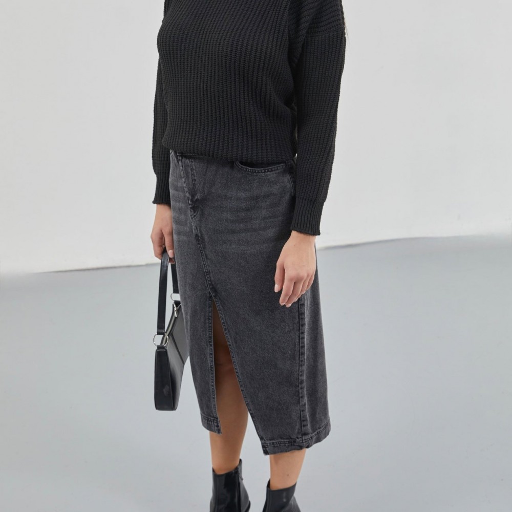 Asimetrik Bel Detaylı, Beş Cepli, Önü Yırtmaçlı, Midi Boy Denim Etek M