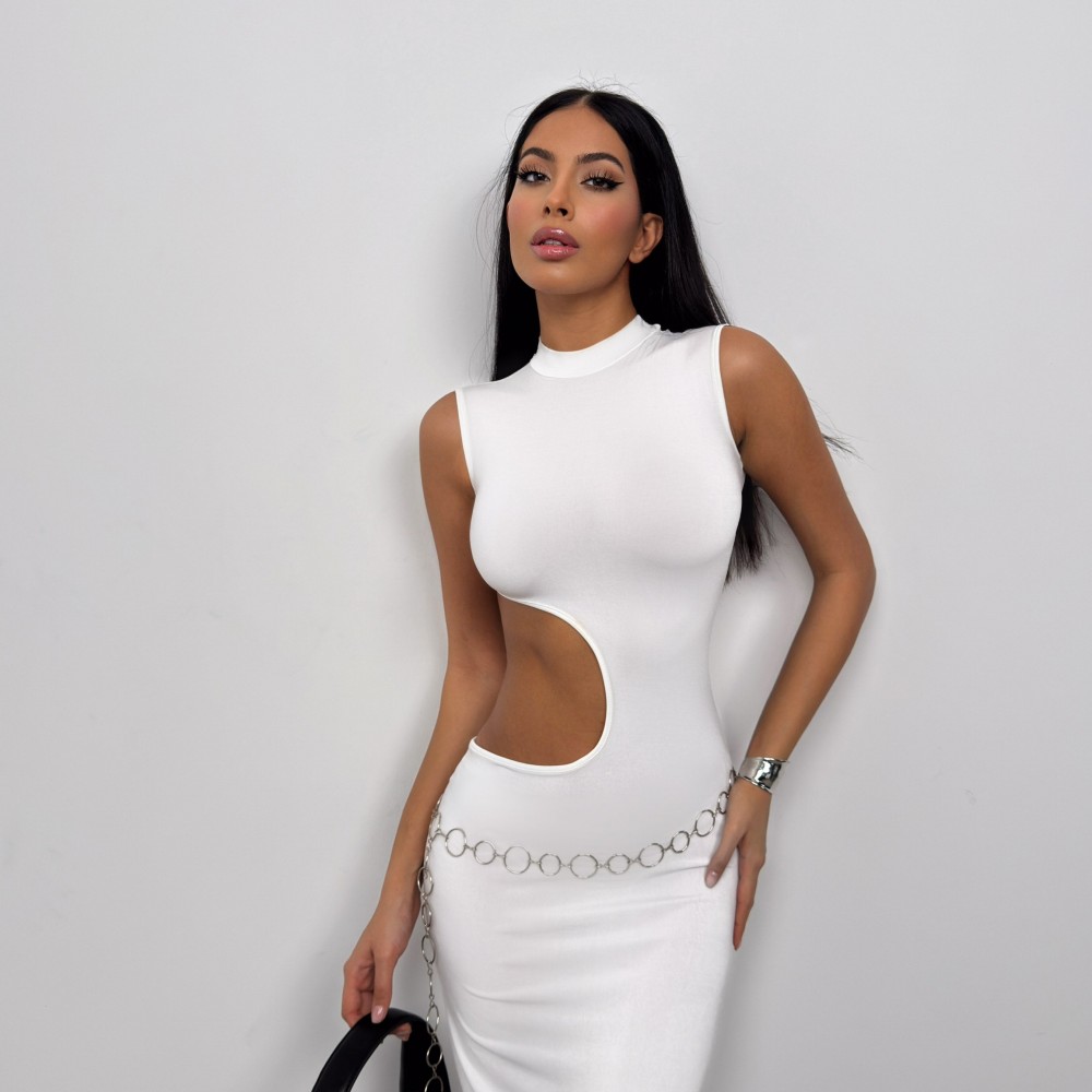 Asimetrik Bel Kemerli, Sıfır Yaka, Kalın Askılı, Maxi Boy, Elbise Mank