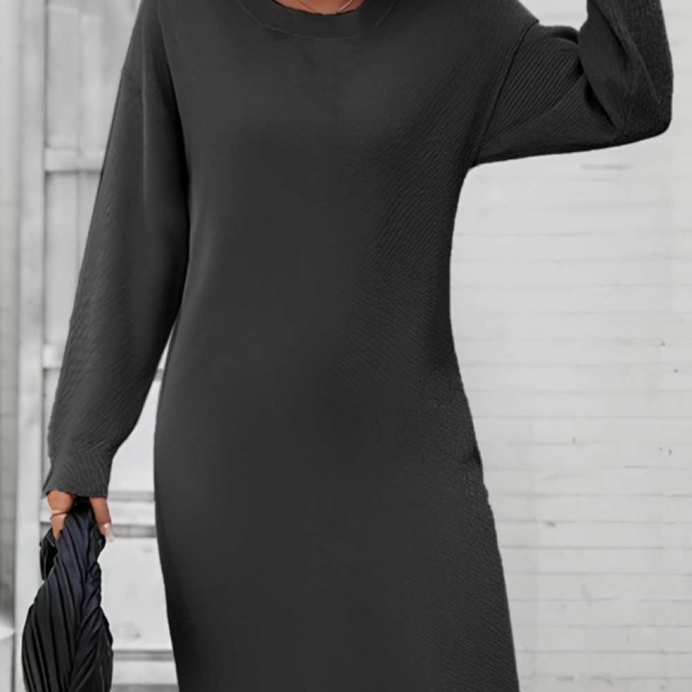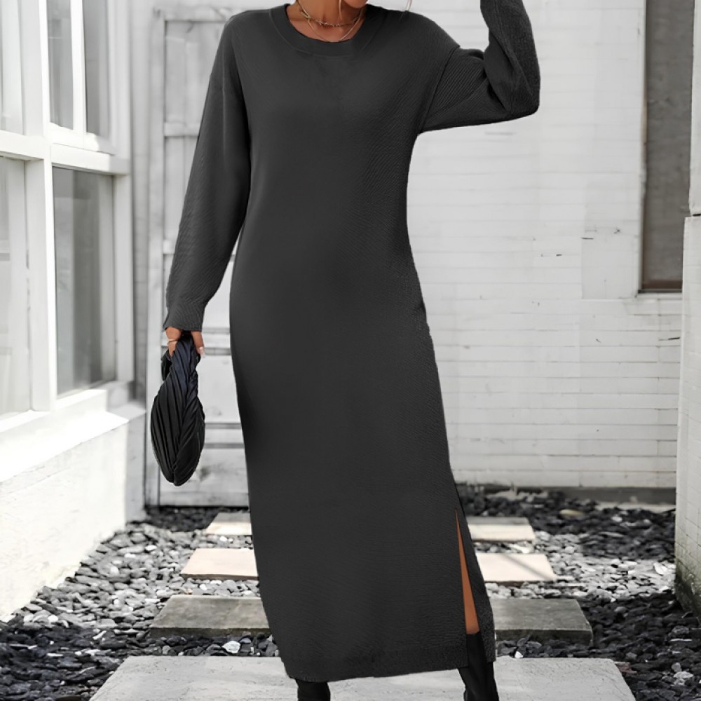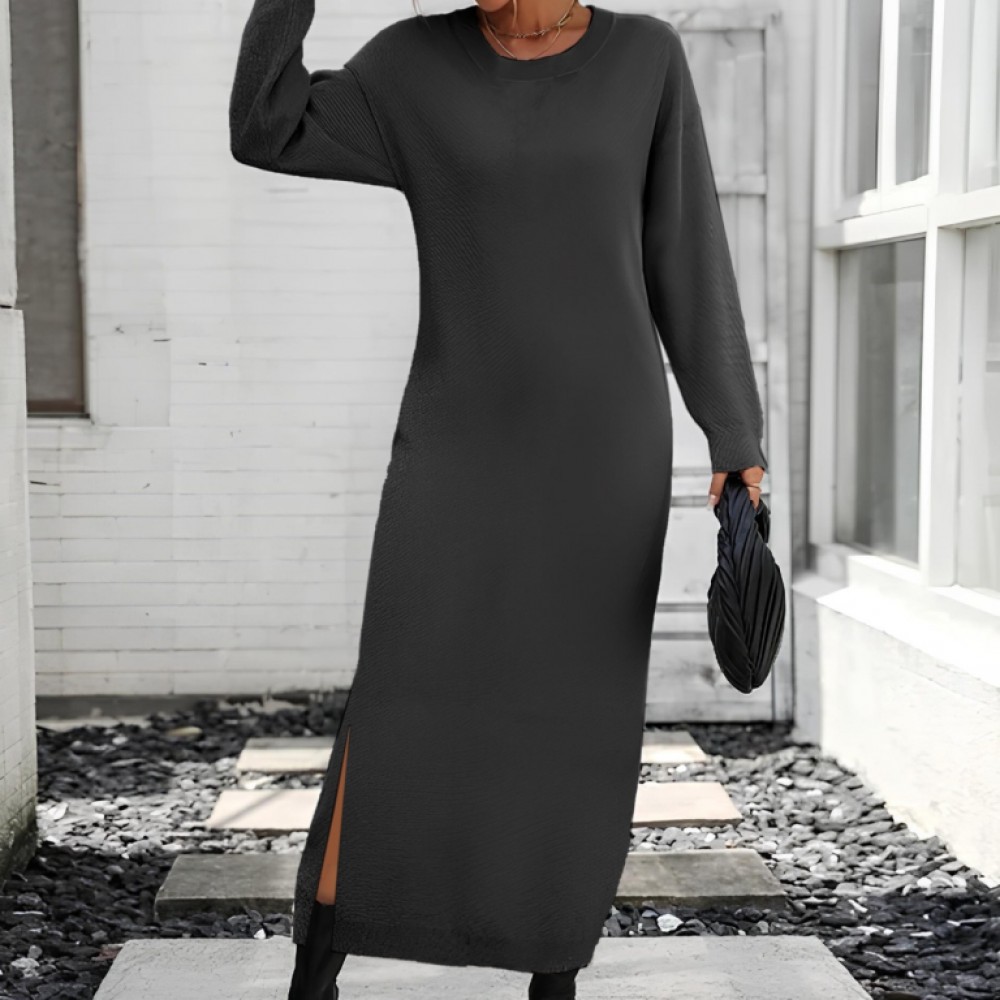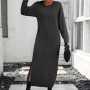 Kadın Uzun Kollu Bisiklet Yaka Yırtmaç Detay Triko Midi Boy Elbise