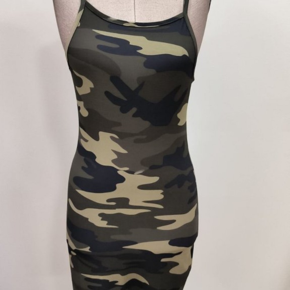 Kadın Omuzlardan Açık Askılı Kamuflaj Desenli Kısa Süprem Elbise