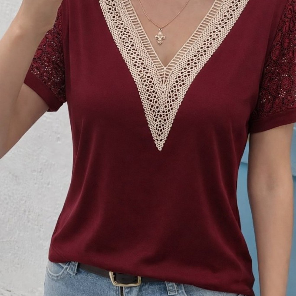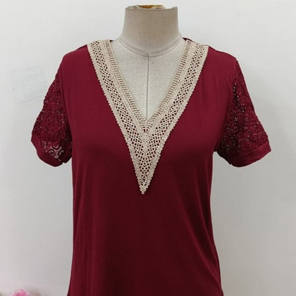 Kadın Kısa Kollu V Yakalı Dantel Detaylı Viskon Bluz