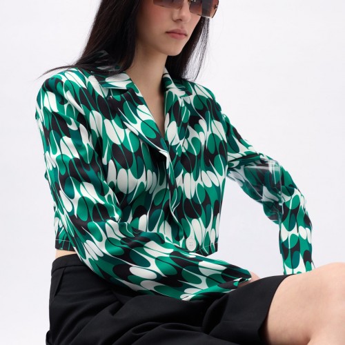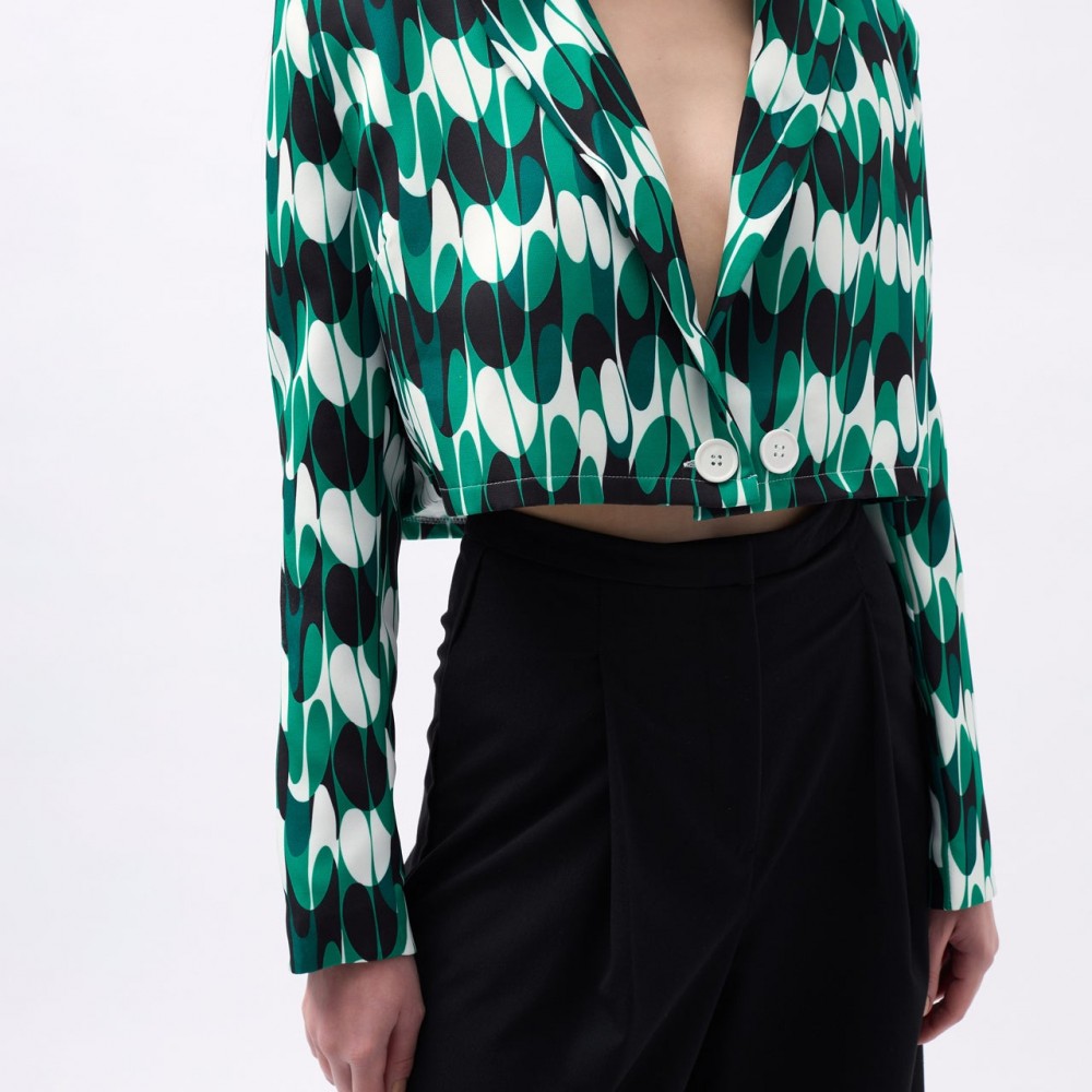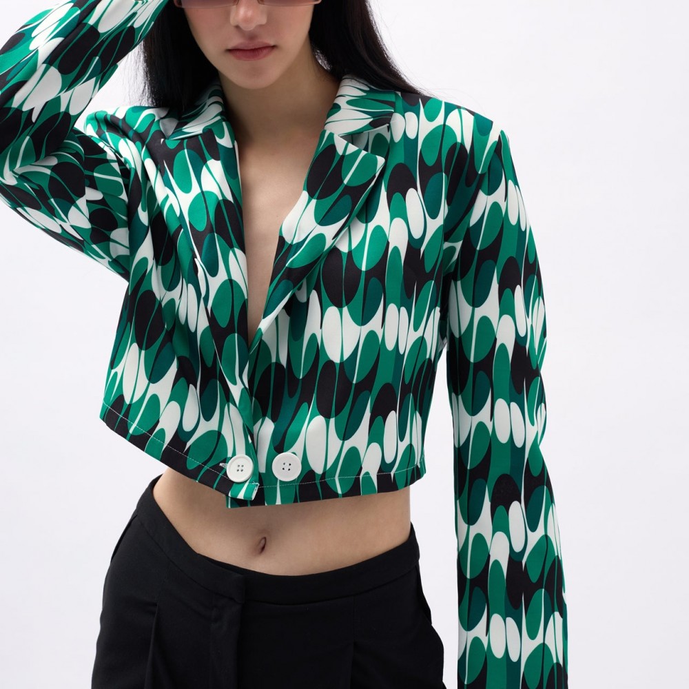 Desenli, Simetrik Görünümlü, Katlamalı Yaka, Tek Düğmeli, Crop, Blazer