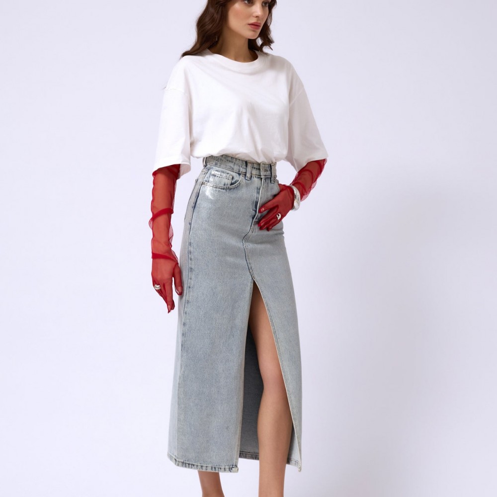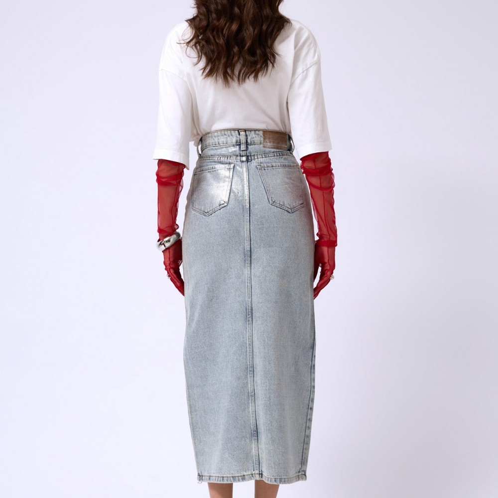 Maxi Boy, Düğmeli, Cepli, Varak Kaplamalı, Önden Yırtmaçlı Etek Manken